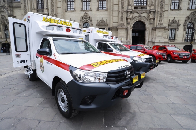 Se trata de 11 ambulancias, 7 camionetas de rescate, 3 autobombas, 60 mototrozadoras, 1 cámara térmica, 125 discos de corte, todas herramientas de rescate para atender las emergencias médicas, accidentes vehiculares, incendios, fugas de gas licuado, que serán distribuidas en todo el país.
