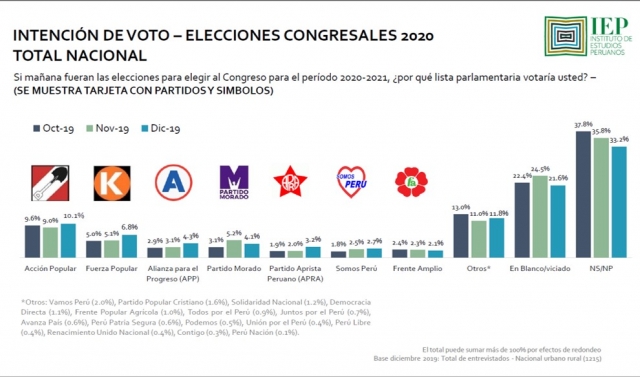 ERP. Los peruanos viven una etapa prenavideña y aún no tienen formada la idea del por quién votar. De acuerdo al Instituto de Estudios Peruanos, en su trabajo de diciembre 2019, lo prevaleciente es la indecisión, seguido de los nulos, viciados y en blanco, en contra de la intención de voto por algún partido, donde Acción Popular a nivel nacional sigue capitalizando preferencias.