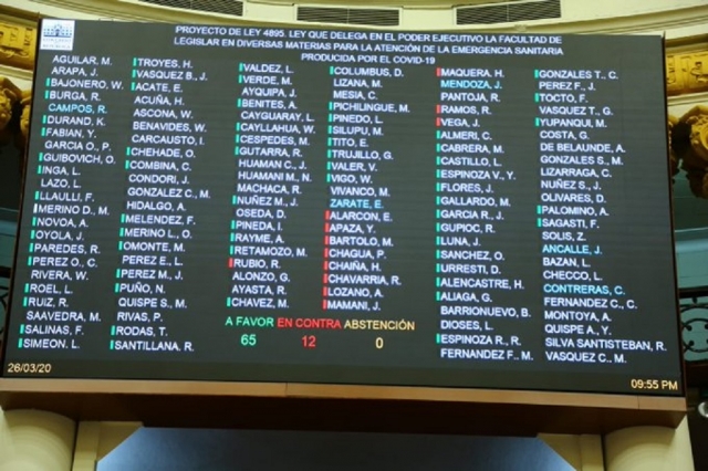 ERP. Aún a riesgo de contraer el Covid-19, los parlamentarios se reunieron de manera presencial y aprobaron el proyecto que presentó el Ejecutivo para emitir normas en la emergencia actual. Por mayoría, el pleno del Congreso aprobó esta noche el pedido del Ejecutivo para la delegación de facultades por 45 días, a fin de que pueda legislar en temas relacionados a la atención de la emergencia por el coronavirus.