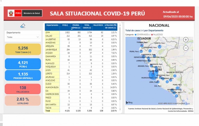 ERP. A 138 se elevó el número de fallecidos a causa del coronavirus (Covid-19) en el Perú. Según el reporte de la sala situacional del Ministerio de Salud (Minsa), las víctimas mortales fueron 17 de ayer a hoy. Con relación al procesamiento de las muestras (moleculares y serológicas o rápidas), el Minsa informa que hasta hoy se han procesado muestras para 48,465 personas por Covid-19, obteniéndose, hasta las 00:00h, 5,256 resultados positivos y 43,209 negativos.