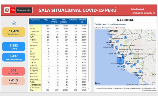 ERP. Los contagios no amainan y al contrario crecen, en tanto que las defunciones se incrementan. El Ministerio de Salud informó que el número de fallecidos a causa del covid-19 en Perú, aumentó a 348. Al 18 de abril de 2020 se han procesado muestras para 135 895 personas por Covid-19, obteniéndose, hasta las 00:00h, 14 420 resultados positivos y 121 475 negativos.
