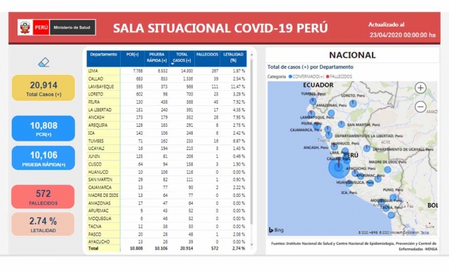 ERP. El Ministerio de Salud anunció 20 914 casos positivos, 2786 hospitalizados y 572 fallecidos. Al 23 de abril de 2020 se han procesado muestras para 185 238 personas por Covid-19, de los cuales 164 324 son negativos.