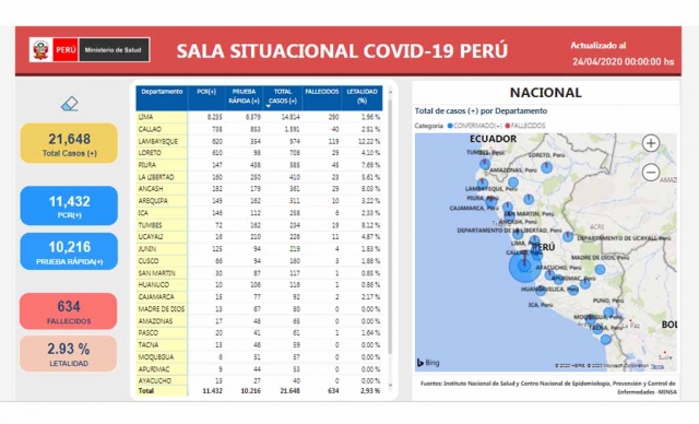 ERP. El Ministerio de Salud anunció 21 648 casos positivos y 634 fallecidos en el Perú. Al 24 de abril de 2020 se han procesado muestras para 198 349 personas por Covid-19, obteniéndose, hasta las 00:00h, 21 648 resultados positivos y 176 701 negativos.