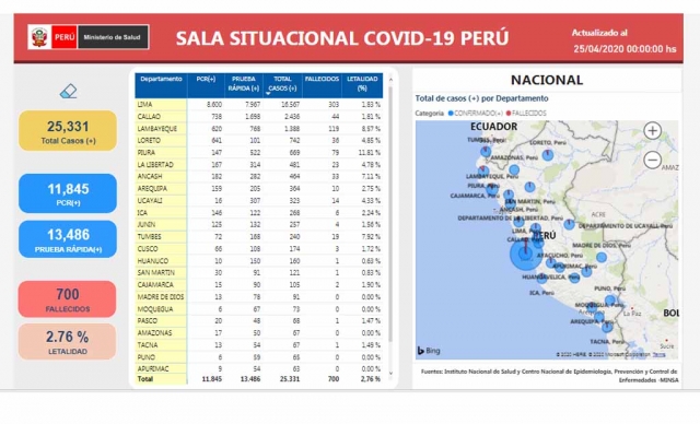 ERP. A 700 se elevó el número de personas fallecidas a causa del coronavirus covid-19; mientras que los casos positivos suman a la fecha 25,331 en Perú, informó el Ministerio de Salud (Minsa).