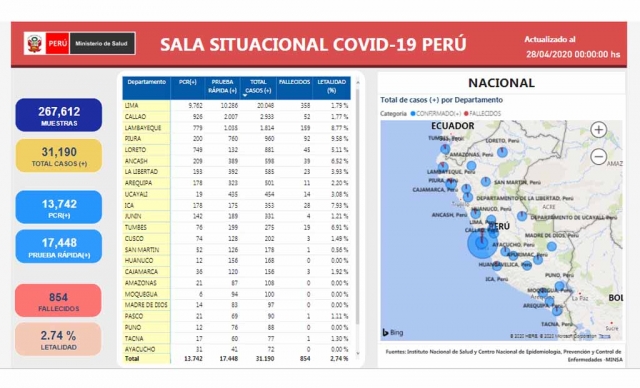 ERP. El Ministerio de Salud (Minsa) informó este martes 28 que se elevó a 31.190 el número de casos por coronavirus (COVID-19) en el país y el número de fallecidos asciende a 854. Al 28 de abril de 2020 se han procesado muestras para 267 612 personas por Covid-19, obteniéndose, hasta las 00:00h, 31 190 resultados positivos y 236 422 negativos.