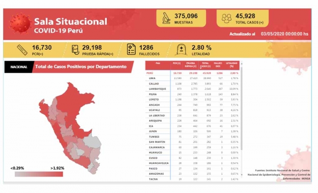 ERP. El número de fallecidos por Covid-19 en el país se elevó a 1,286 y a 45,928 los casos positivos, informó el Ministerio de Salud (Minsa). Al 03 de mayo de 2020 se han procesado muestras para 375 096 personas por Covid-19, obteniéndose, hasta las 00:00h, 45 928 resultados positivos y 329 168 negativos.