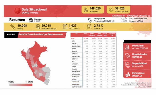 ERP. El número de fallecidos por Covid-19 en el país se elevó a 1,627 y a 58,526 los casos positivos, informó el Ministerio de Salud (Minsa). Al 07 de mayo de 2020 se han procesado muestras para 448 020 personas por Covid-19, obteniéndose, hasta las 00:00h, 58 526 resultados positivos y 389 494 negativos.