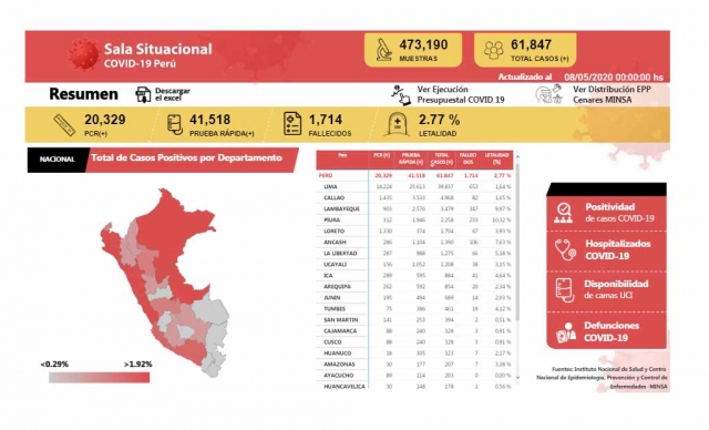 ERP. El número de fallecidos por Covid-19 en el país se elevó a 1,714 y a 61,847 los casos positivos, informó el Ministerio de Salud (Minsa). Al 08 de mayo de 2020 se han procesado muestras para 473 190 personas por Covid-19, obteniéndose, hasta las 00:00h, 61 847 resultados positivos y 411 343 negativos.
