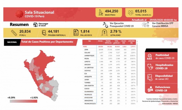 ERP. El número de fallecidos por Covid-19 en el país se elevó a 1,814 y a 65,015 los casos positivos, informó el Ministerio de Salud (Minsa). Al 09 de mayo de 2020 se han procesado muestras para 494 520 personas por Covid-19, obteniéndose, hasta las 00:00h, 65,015 resultados positivos y 429 235 negativos.