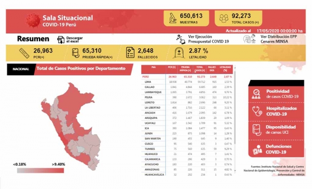 ERP. A 2,648 se elevó el número de fallecidos a causa del coronavirus covid-19 en Perú; mientras que los casos positivos totalizan 92,273, informó el Ministerio de Salud (Minsa). Al 17 de mayo de 2020 se han procesado muestras para 650 613 personas por Covid-19, obteniéndose, hasta las 00:00h, 92 273 resultados positivos y 558 340 negativos.