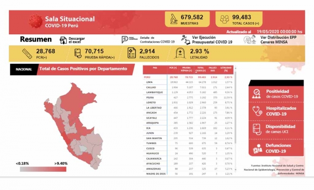 ERP. A 2,914 se elevó el número de fallecidos a causa del coronavirus covid-19 en Perú; mientras que los casos positivos totalizan 99,483, informó el Ministerio de Salud (Minsa). Al 19 de mayo de 2020 se han procesado muestras para 679 582 personas por Covid-19, obteniéndose, hasta las 00:00h, 99 483 resultados positivos y 580 099 negativos.