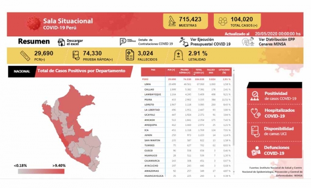 ERP. A 3,024 se elevó el número de fallecidos a causa del coronavirus covid-19 en Perú; mientras que los casos positivos totalizan 104,020; informó el Ministerio de Salud (Minsa). Al 20 de mayo de 2020 se han procesado muestras para 715 423 personas por Covid-19, obteniéndose, hasta las 00:00h, 104 020 resultados positivos y 611 403 negativos.