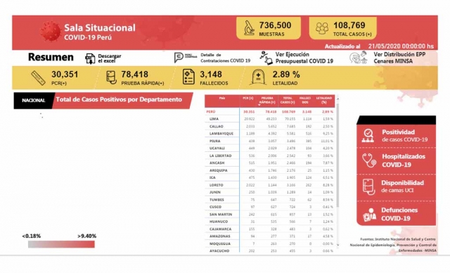 ERP. A 3,148 se elevó el número de fallecidos a causa del coronavirus covid-19 en Perú; mientras que los casos positivos totalizan 108,769; informó el Ministerio de Salud (Minsa). Al 21 de mayo de 2020 se han procesado muestras para 736 500 personas por Covid-19, obteniéndose, hasta las 00:00h, 108 769 resultados positivos y 627 731 negativos.