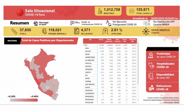 ERP. A 4,371 se elevó el número de fallecidos a causa del coronavirus covid-19 en Perú; mientras que los casos positivos totalizan 155,671; informó el Ministerio de Salud (Minsa). Al 30 de mayo de 2020 se han procesado muestras para 1’012,708 personas por Covid-19, obteniéndose, hasta las 00:00h, 155 671 resultados positivos y 857 037 negativos.
