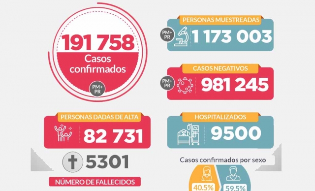 Personas muestreadas: 1’173,003. Pruebas moleculares: 159,169; Pruebas (serológicas) rápidas: 1’013,834. Negativas: 981,245; Pruebas moleculares: 115,151; Pruebas (serológicas) rápidas: 866,094. Positivas: 191,758; Pruebas moleculares: 44,018; Pruebas (serológicas) rápidas: 147,740.
