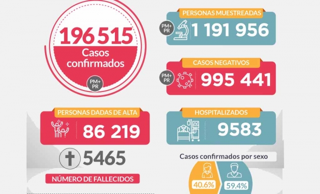 Personas muestreadas: 1’191,956. Pruebas moleculares: 163,538; Pruebas (serológicas) rápidas: 1’028,418. Negativas: 995,441; Pruebas moleculares: 117,654; Pruebas (serológicas) rápidas: 877,787. Positivas: 196,515; Pruebas moleculares: 45,884; Pruebas (serológicas) rápidas: 150,631.