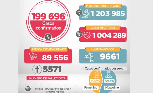 Personas muestreadas: 1’203,985. Pruebas moleculares: 168,288; Pruebas (serológicas) rápidas: 1’035,697. Negativas: 1’004,289; Pruebas moleculares: 121,035; Pruebas (serológicas) rápidas: 883,254. Positivas: 199,696; Pruebas moleculares: 47,253; Pruebas (serológicas) rápidas: 152,443.