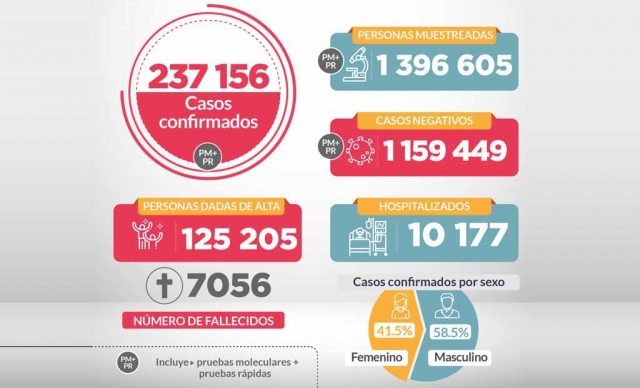 Personas muestreadas: 1’396,605. Pruebas moleculares: 198,817; Pruebas (serológicas) rápidas: 1’197,788. Negativas: 1’159,449; Pruebas moleculares: 142,720; Pruebas (serológicas) rápidas: 1’016,729. Positivas: 237,156; Pruebas moleculares: 56,097; Pruebas (serológicas) rápidas: 181,059.