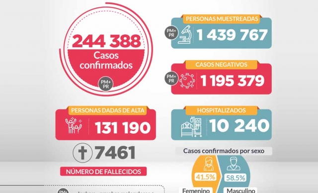 Personas muestreadas: 1’439,767. Pruebas moleculares: 206,423; Pruebas (serológicas) rápidas: 1’233,344. Negativas: 1’195,379; Pruebas moleculares: 147,950; Pruebas (serológicas) rápidas: 1’047,429. Positivas: 244,388; Pruebas moleculares: 58,473; Pruebas (serológicas) rápidas: 185,915.