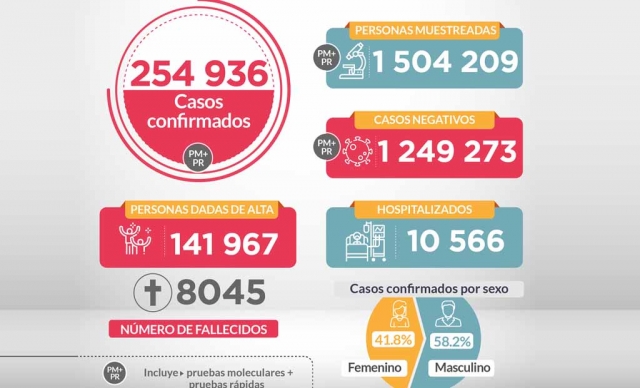 Personas muestreadas: 1’504,209. Pruebas moleculares: 215,933; Pruebas (serológicas) rápidas: 1’288,276. Negativas: 1’249,273; Pruebas moleculares: 154,797; Pruebas (serológicas) rápidas: 1’094,476. Positivas: 254,936; Pruebas moleculares: 61,136; Pruebas (serológicas) rápidas: 193,800.