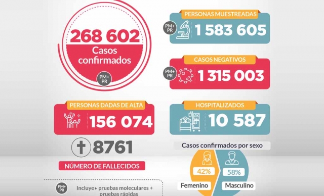 Personas muestreadas: 1’583,605. Pruebas moleculares: 232,730; Pruebas (serológicas) rápidas: 1’350,875. Negativas: 1’315,003; Pruebas moleculares: 166,729; Pruebas (serológicas) rápidas: 1’148,274. Positivas: 268,602; Pruebas moleculares: 66,001; Pruebas (serológicas) rápidas: 202,601.
