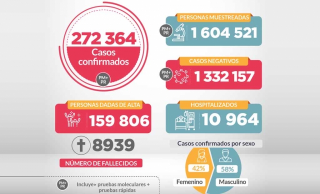 Personas muestreadas: 1’604,521. Pruebas moleculares: 237,888; Pruebas (serológicas) rápidas: 1’366,633. Negativas: 1’332,157; Pruebas moleculares: 170,397; Pruebas (serológicas) rápidas: 1’161,760. Positivas: 272,364; Pruebas moleculares: 67,491;Pruebas (serológicas) rápidas: 204,873.