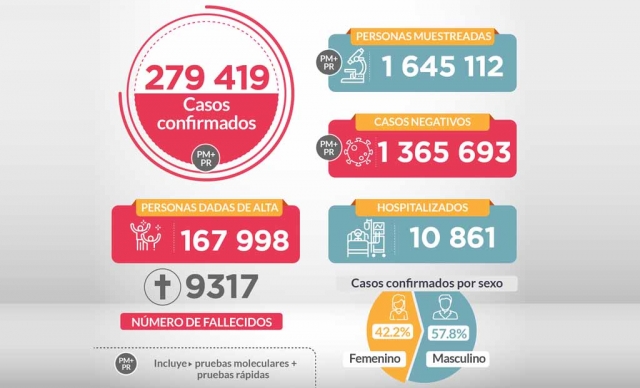 Personas muestreadas: 1’645,112. Pruebas moleculares: 245,315; Pruebas (serológicas) rápidas: 1’399,797. Negativas: 1’365,693; Pruebas moleculares: 175,786; Pruebas (serológicas) rápidas: 1’189,907. Positivas: 279,419; Pruebas moleculares: 69,529; Pruebas (serológicas) rápidas: 209,890.