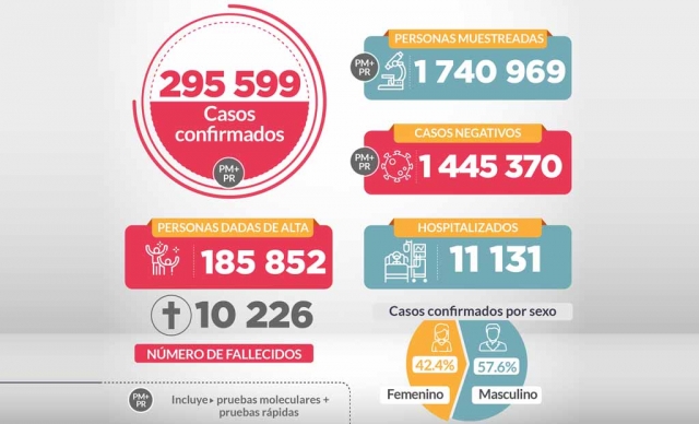 Personas muestreadas: 1’740,969. Pruebas moleculares: 259,036; Pruebas (serológicas) rápidas: 1’481,933. Negativas: 1’445,370; Pruebas moleculares: 184,993; Pruebas (serológicas) rápidas: 1’260,377. Positivas: 295,599; Pruebas moleculares: 74,043; Pruebas (serológicas) rápidas: 221,556.