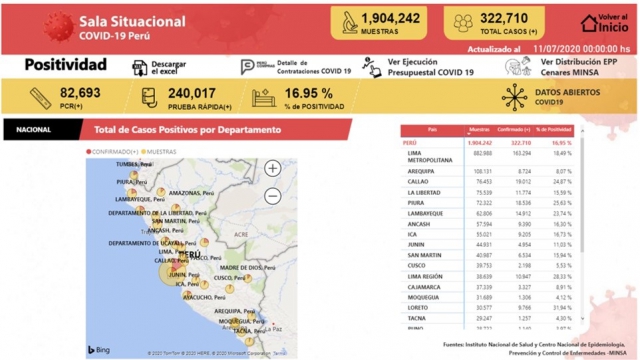 ERP. La Situacional Covid-19 a cargo Instituto Nacional de Salud y Centro Nacional de Epidemiologia, Prevencion y Control de Enfermedades del Ministerio de Salud informó que a la fecha se han procesado muestras para 1’904,242 personas por Covid-19, obteniéndose, hasta las 00:00h, 322,710 resultados positivos y 1’581,532 negativos; de igual manera se tienen 11,932 pacientes hospitalizados con Covid-19, de los cuales, 1,315 se encuentran en UCI con ventilación mecánica y 11,682 fallecidos.
