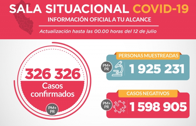 ERP. El Instituto Nacional de Salud y Centro Nacional de Epidemiologia, Prevencion y Control de Enfermedades del Ministerio de Salud informó sobre la Sala Situacional COVID-19 correspondiente al 12 de julio, indicando que a la fecha se tiene 326,326 casos positivos; en tanto que los fallecidos llegan a 11,870; estos datos se encuentran distorsionados considerando que no se corresponde con algunas regiones.