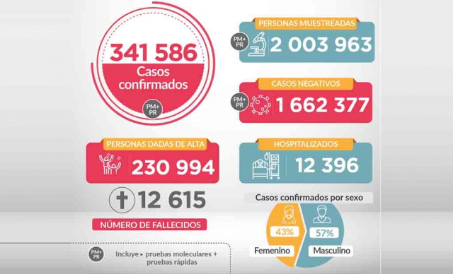 Personas muestreadas: 2’003,963. Pruebas moleculares: 309,746; Pruebas (serológicas) rápidas: 1’694,217. Negativas: 1’662,377; Pruebas moleculares: 219,699; Pruebas (serológicas) rápidas: 1’442,678. Positivas: 341,586; Pruebas moleculares: 90,047; Pruebas (serológicas) rápidas: 251,539.