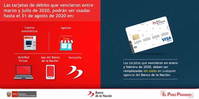 ERP. El Banco de la Nación informa que todas las tarjetas de débito que vencieron entre marzo y julio de 2020, sí podrán ser usadas hasta el 31 de agosto de 2020 a través de nuestros siguientes canales: cajeros automáticos, agentes MultiRed, App del Banco de la Nación, MultiRed Virtual y ventanillas.