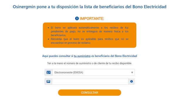 Los interesados deben ingresar a la página web bonoelectricidad.pe y a la página de cada empresa prestadora de electricidad. Podrán conocer si les corresponde el bono solo ingresando su número de suministro.