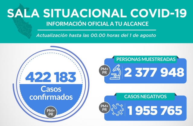 Con relación al procesamiento de las muestras (moleculares y serológicas o rápidas) por coronavirus Covid-19, el Ministerio de Salud (Minsa) informa a la población que al 1 de agosto se han procesado muestras para 2’377,948 personas por Covid-19, obteniéndose, hasta las 00:00h, 422,183 resultados positivos y 1’955,765 negativos; las personas muestreadas son 2’377,948; igualmente las negativas: 1’955,765.