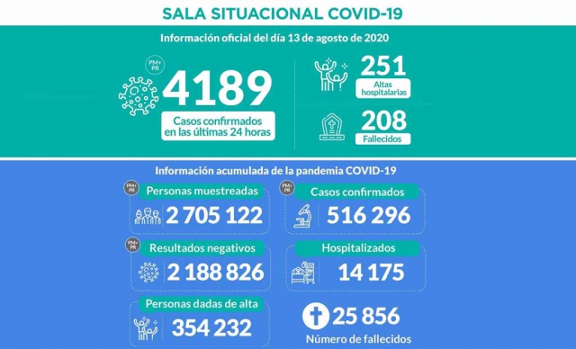 El 13 de agosto se registraron los resultados de 28 108 personas muestreadas, de los cuales 4 189 fueron casos confirmados de ese día.