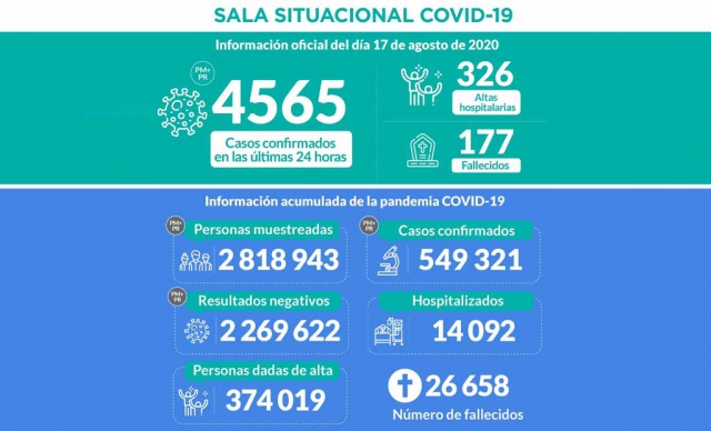 El 17 de agosto se registraron los resultados de 25 329 personas muestreadas, de los cuales 4 565 fueron casos confirmados de ese día.