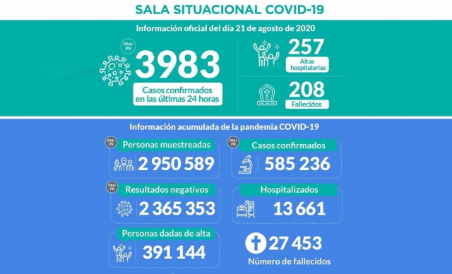 Durante el 21 de agosto se registraron los resultados de 35 217 personas muestreadas, de los cuales 3 983 fueron casos confirmados de ese día.