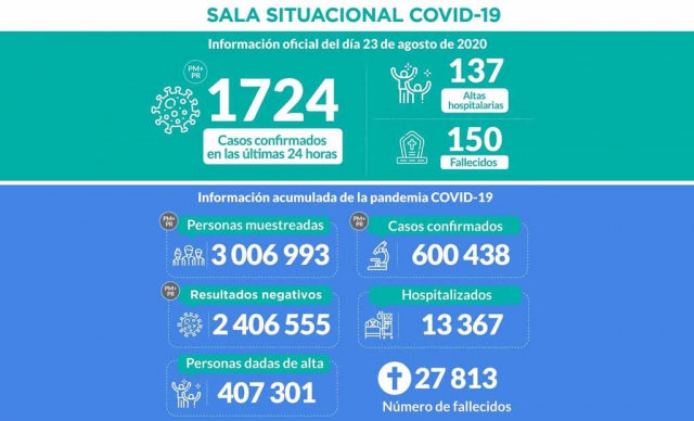 Durante el 23 de agosto se registraron los resultados de 21 211 personas muestreadas, de los cuales 1 724 fueron casos confirmados de ese día.