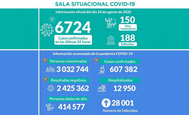 Durante el 24 de agosto se registraron los resultados de 25 751 personas muestreadas, de los cuales 6 724 fueron casos confirmados de ese día.