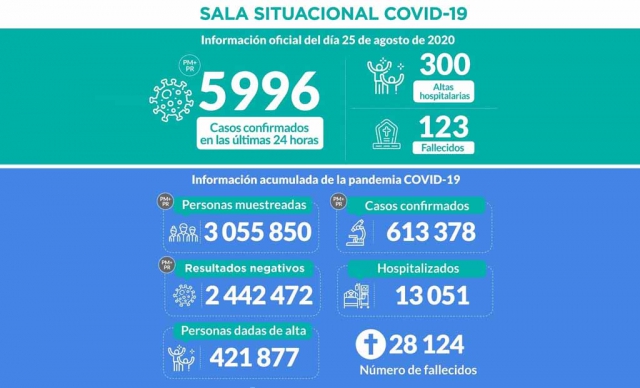 Durante el 25 de agosto se registraron los resultados de 23 106 personas muestreadas, de los cuales 5 996 fueron casos confirmados de ese día.