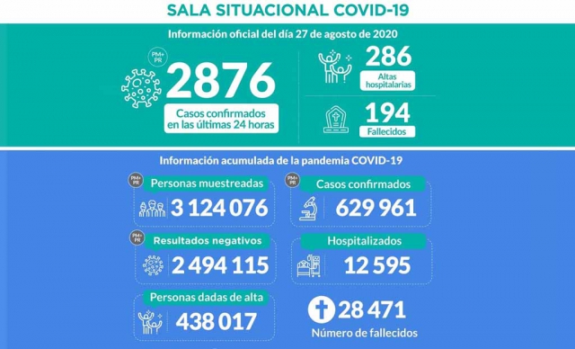 Durante el 27 de agosto se registraron los resultados de 34 617 personas muestreadas, de los cuales 2 876 fueron casos confirmados de ese día.