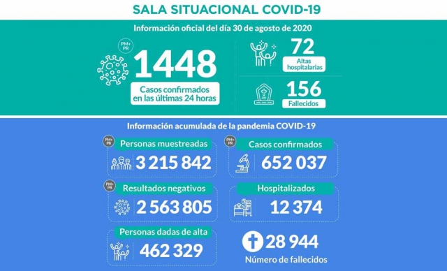 Durante el 30 de agosto se registraron los resultados de 23 992 personas muestreadas, de los cuales 1 448 fueron casos confirmados de ese día.