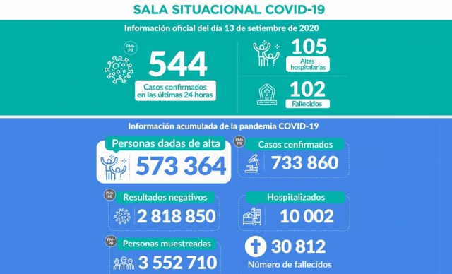 Durante el 13 de septiembre se registraron los resultados de 17 773 personas muestreadas, de los cuales 544 fueron casos confirmados de ese día.