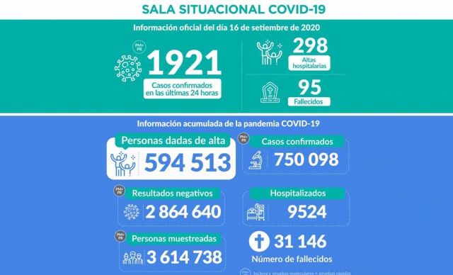 Durante el 16 de septiembre se registraron los resultados de 22 517 personas muestreadas, de los cuales 1 921 fueron casos confirmados de ese día.