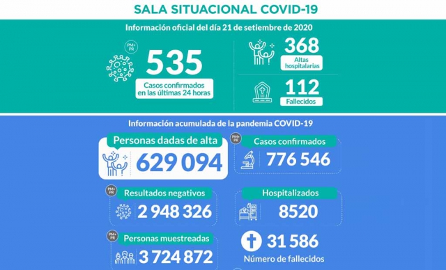 Durante el 21 de septiembre se registraron los resultados de 14 178 personas muestreadas, de los cuales 535 fueron casos confirmados de ese día.