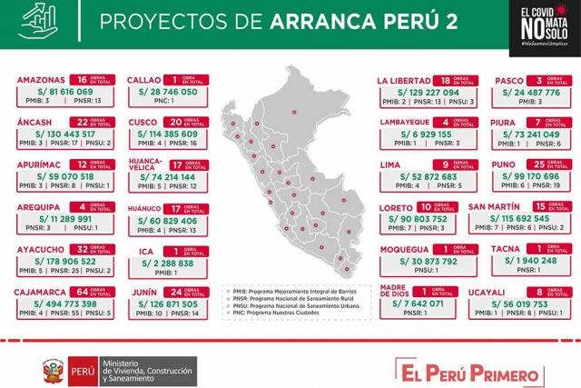 ERP. Como parte de la segunda fase del plan de reactivación económica por inversión pública (Arranca Perú 2), el Ministerio de Vivienda, Construcción y Saneamiento (MVCS) promovió la transferencia a gobiernos regionales y locales de S/ 2 052,336.190 para la ejecución 332 obras de agua y desagüe, proyectos de infraestructura vial y equipamiento urbano (veredas, parques, plazas, losas deportivas y otros).