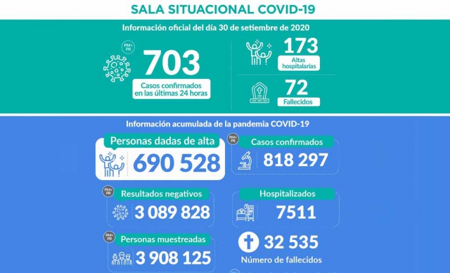 Durante el 30 de septiembre se registraron los resultados de 15 772 personas muestreadas, de los cuales 703 fueron casos sintomáticos confirmados de ese día.