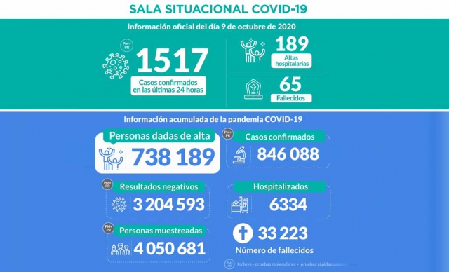 Durante el 9 de octubre se registraron los resultados de 23 190 personas muestreadas, de los cuales 1 517 fueron casos sintomáticos confirmados de ese día.