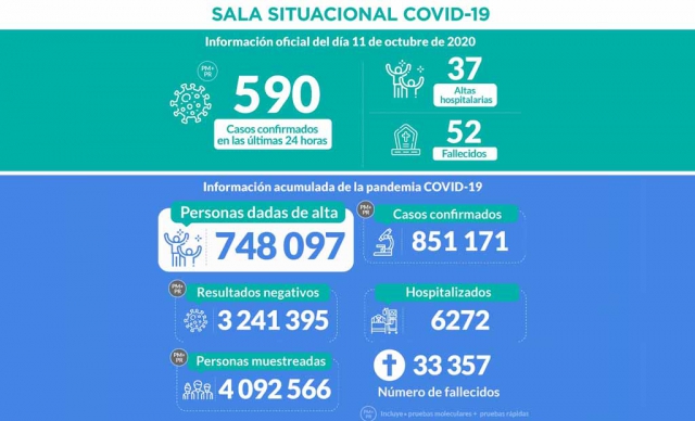 Durante el 11 de octubre se registraron los resultados de 15 209 personas muestreadas, de los cuales 590 fueron casos sintomáticos confirmados de ese día.