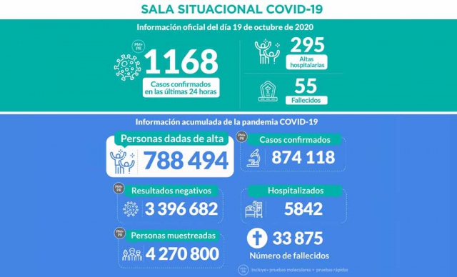 Durante el 19 de octubre se registraron los resultados de 21 342 personas muestreadas, de los cuales 1 168 fueron casos sintomáticos confirmados de ese día.